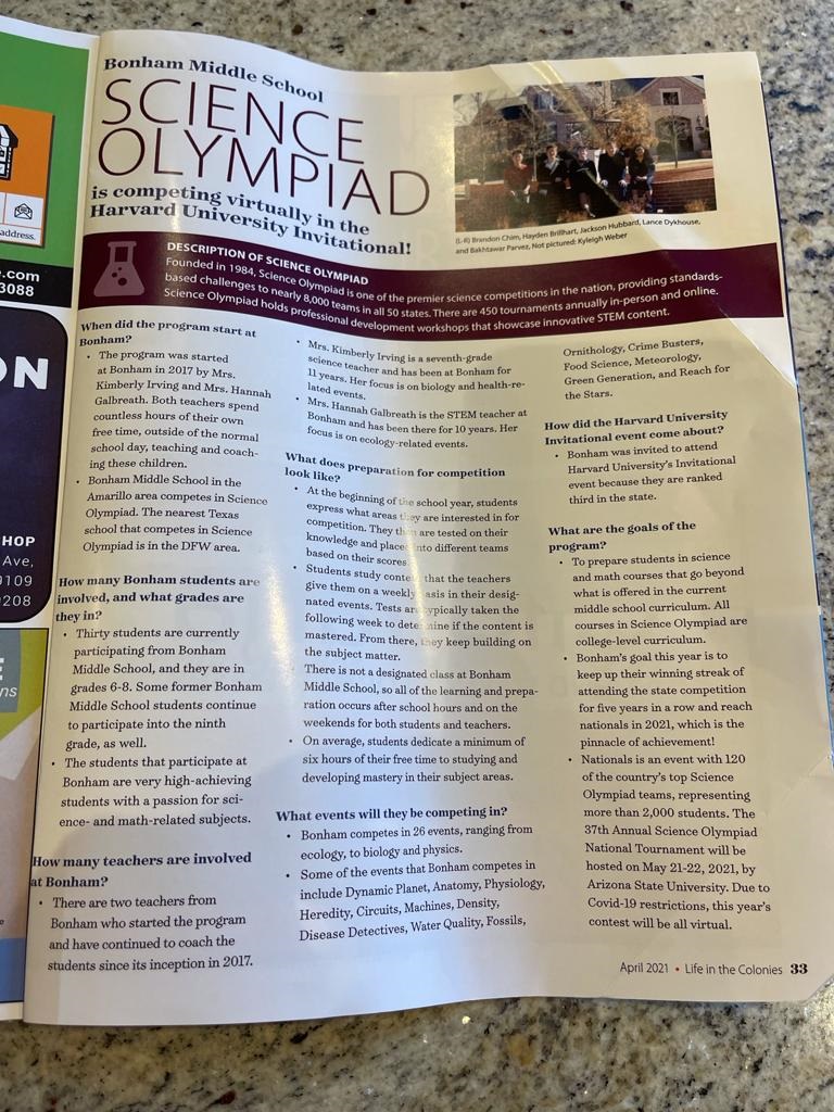 Bonham Middle School Science Olympiad Is Competing Virtually In The Harvard University Invitational!